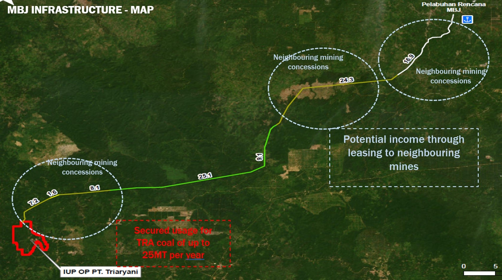MBJ is in the business of developing and operating an integrated infrastructure (hauling road and coal terminal port) for handling coal logistics and transportation to the domestic and export markets. The ready-for-development Integrated Infrastructure approximately 95 km connects key logistical locations providing access for the TRA coal mine and other neighbouring coal mines in the surrounding area (South Sumatra) to international markets. The world-class hauling road and coal terminal port at Lalan River has a targeted capacity of up to 40MT per year, with 25MT reserved for coal from the TRA coal mine per year. It is intended the remaining 15MT of capacity per year will be leased out to surrounding mines.